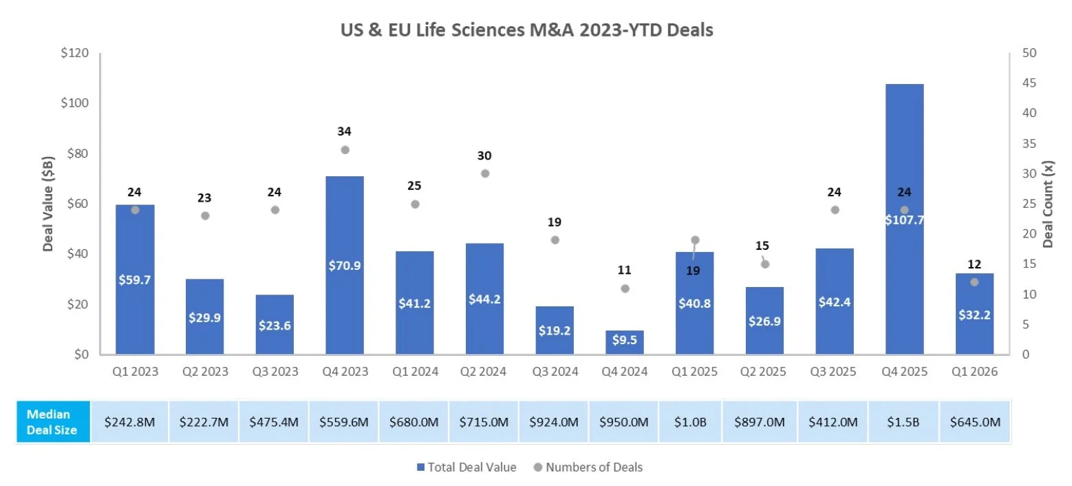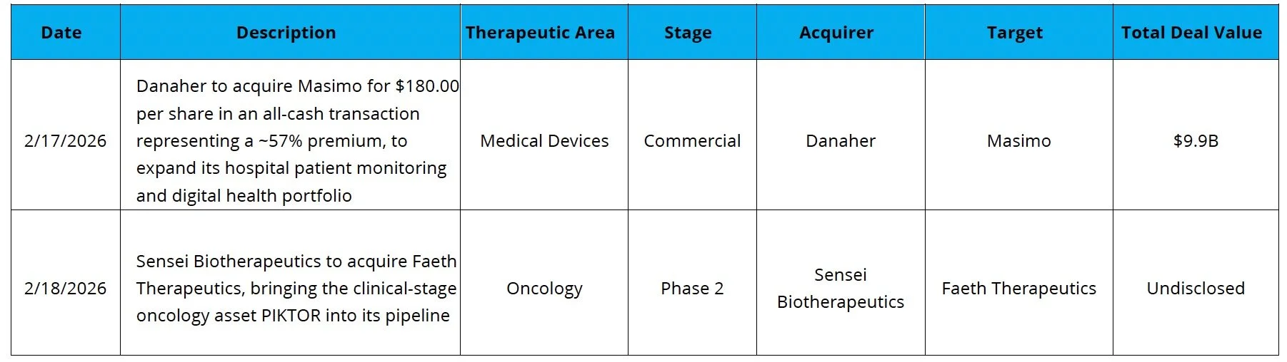 Danaher Bolsters Diagnostics: Danaher acquired Masimo for ~$9.9B at 18x EBITDA, adding to their diagnostics segment which generated $9.8B in revenue in 2025