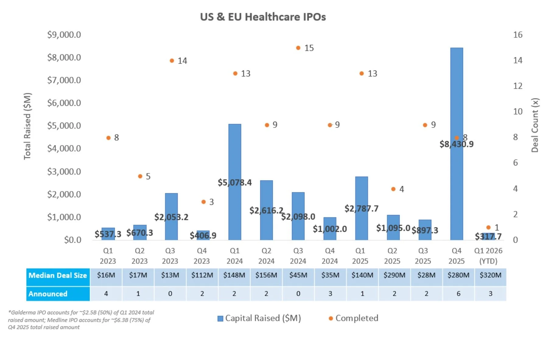 IPOs priced in 2025 and 2026 have generated a median and average return of 2.2% and 13.1% YTD, respectively, suggesting overall performance has been skewed by a small number of outsized winners. Notably, ~50% of newly public companies are trading above their offer price