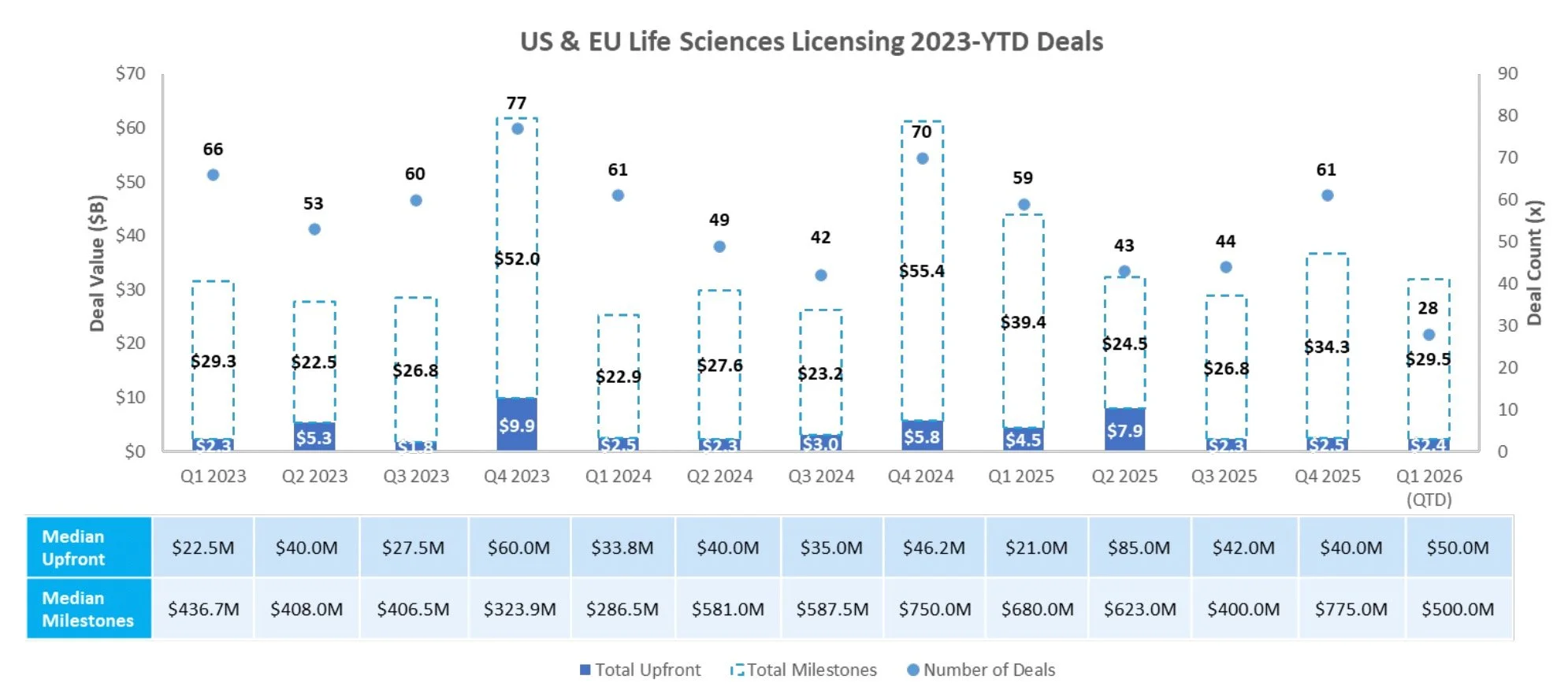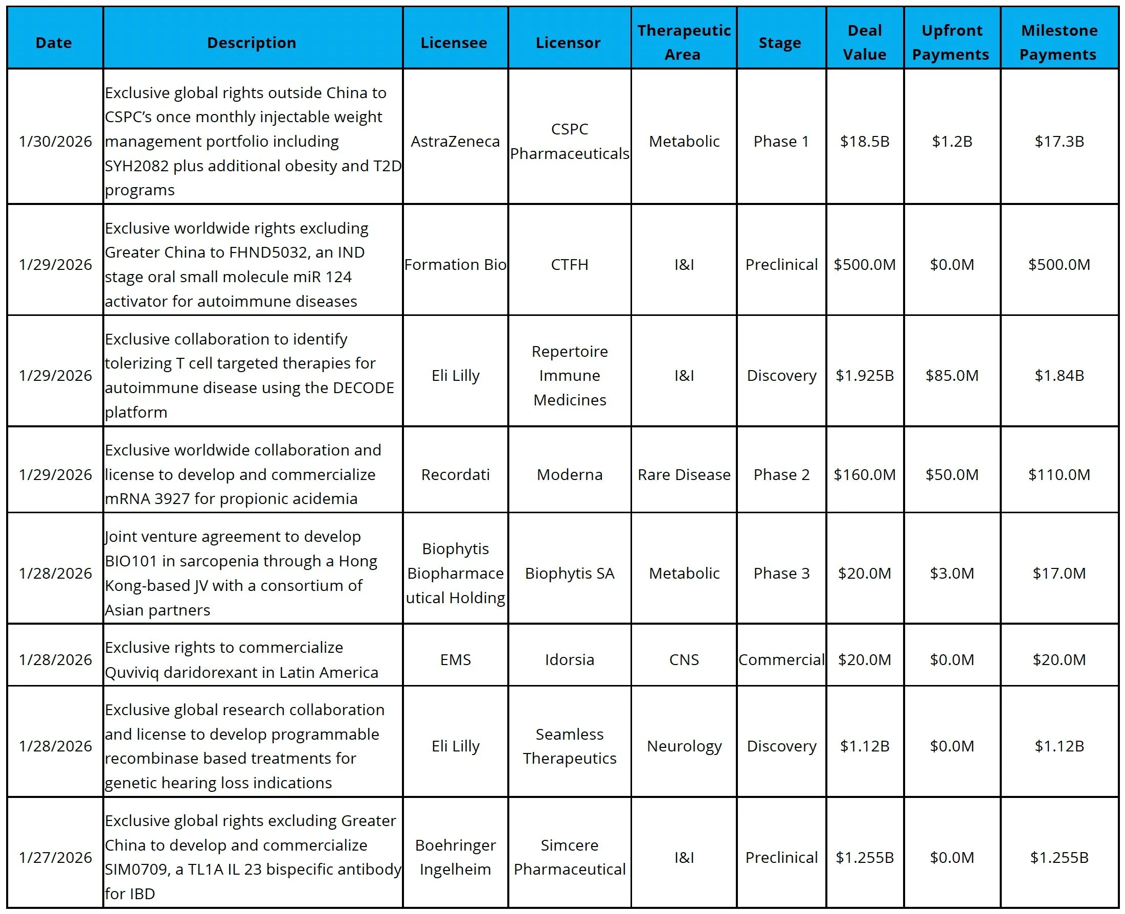 Obesity and China In-Licensing Remain Dominant Themes: AstraZeneca signed a multi-asset licensing deal with CSPC Pharmaceutical Group worth up to $18.5B (including $1.2B upfront) spanning eight programs, highlighted by a clinical-ready GLP-1R/GIPR agonist plus three preclinical assets