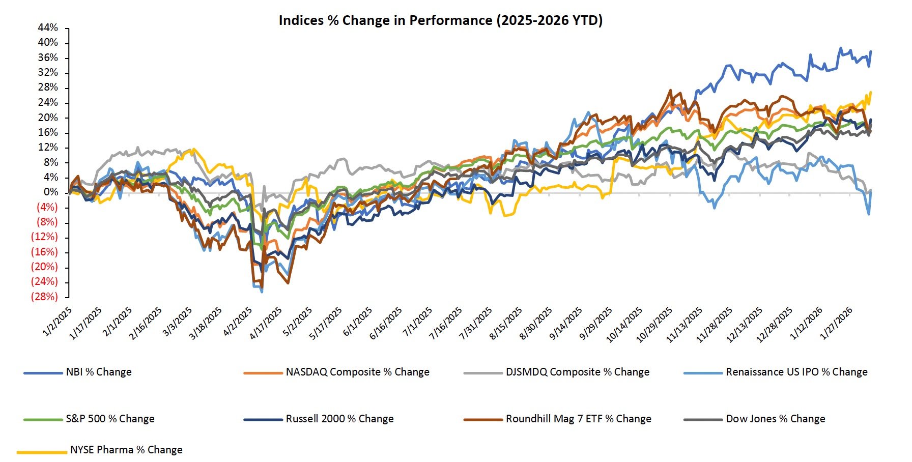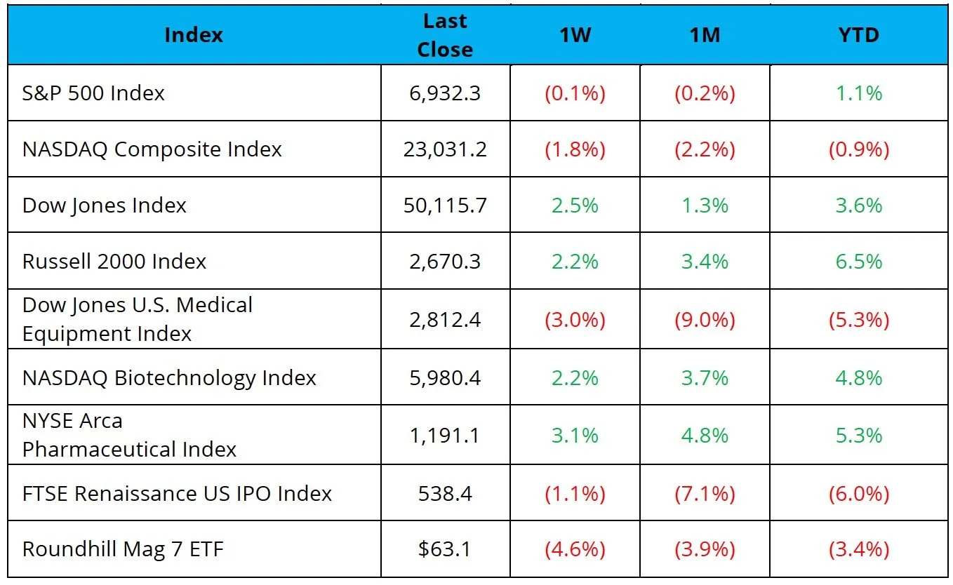 Capital Rotation Out of Tech Continues: The Nasdaq ended the week down 1.8% and is the worst-performing major index YTD, underscoring the rotation of capital out of tech and into sectors like healthcare that are viewed as undervalued relative to technology