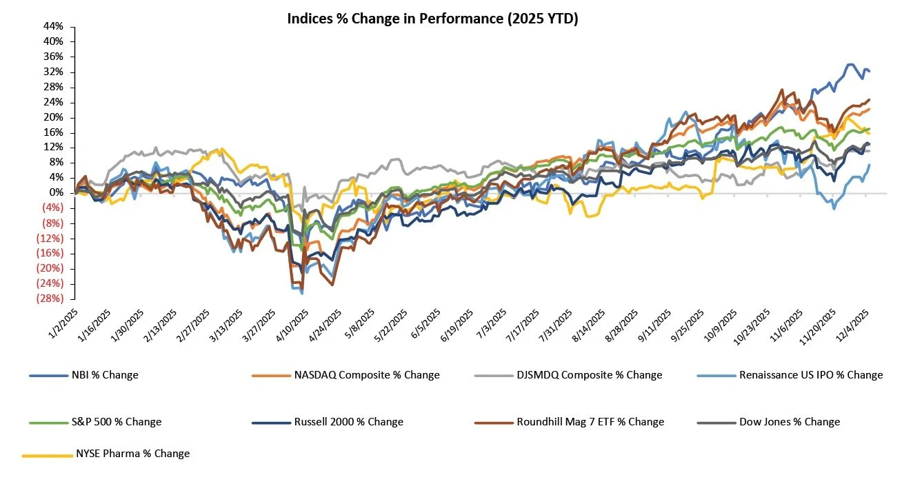 As year-end approaches, the NBI has nearly doubled the S&P 500’s YTD returns, nearly tripled the Dow’s, and outpaced the Nasdaq, highlighting biotech’s relative strength as investors rotate capital into the sector