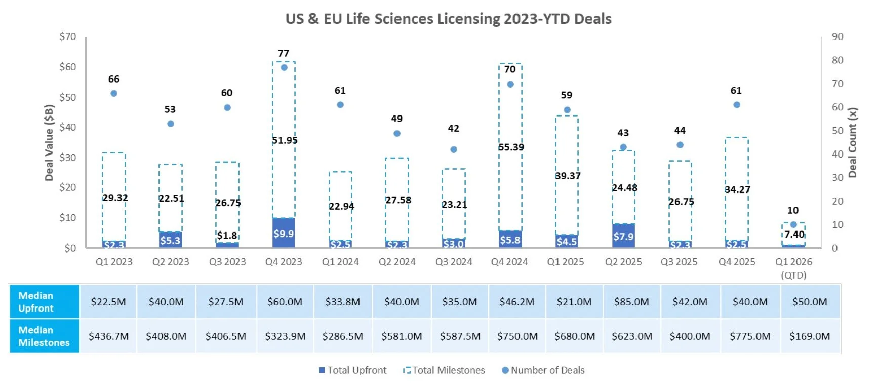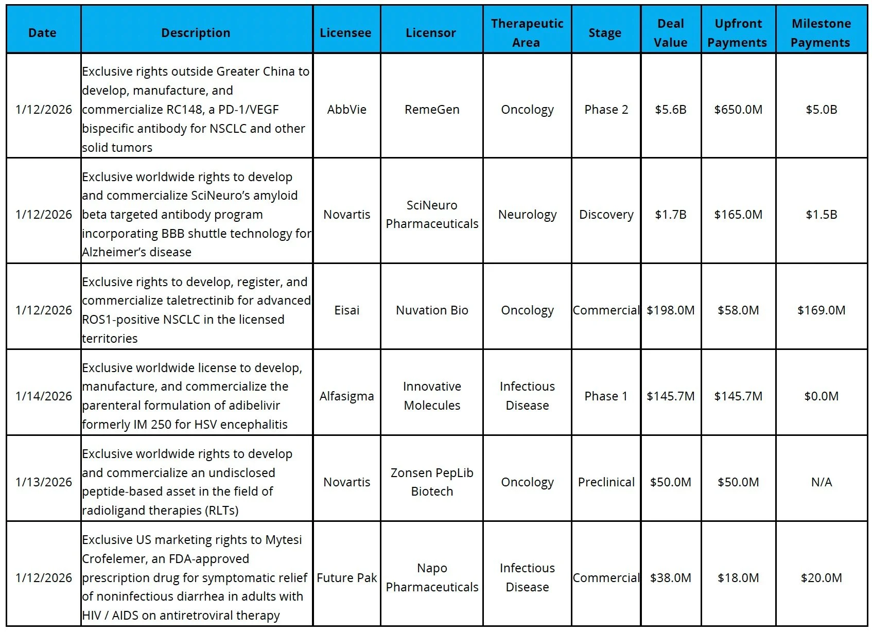 PD-1/VEGF and China in-licensing remains a dominant theme: AbbVie signed an exclusive ex-China licensing deal with RemeGen for its Phase 2 PD-1/VEGF bispecific antibody RC148, paying $650M upfront plus up to ~$5B in milestones to further expand its oncology pipeline