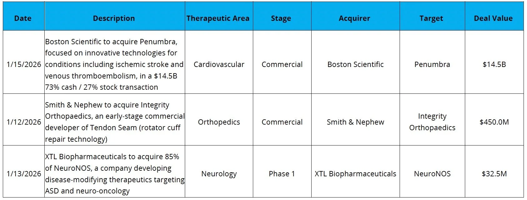 Commercial MedTech M&A activity continues: Boston Scientific agreed to acquire Penumbra in a ~$14.5B cash-and-stock transaction to expand its vascular and neurovascular device footprint and deepen exposure to the fast-growing thrombectomy market