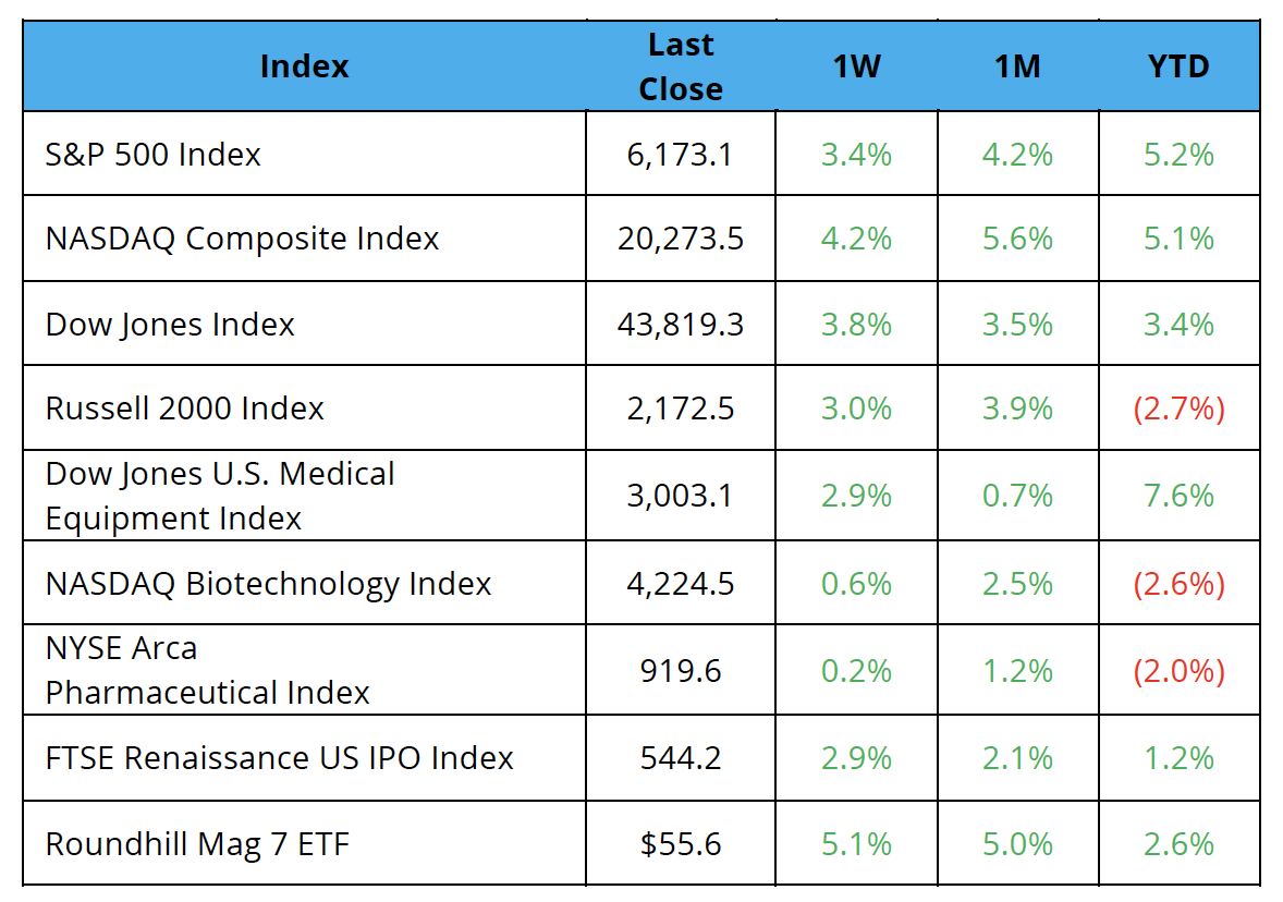 The S&P 500, Nasdaq, and Dow ended the week up 3.4%, 4.2%, and 3.8%, respectively