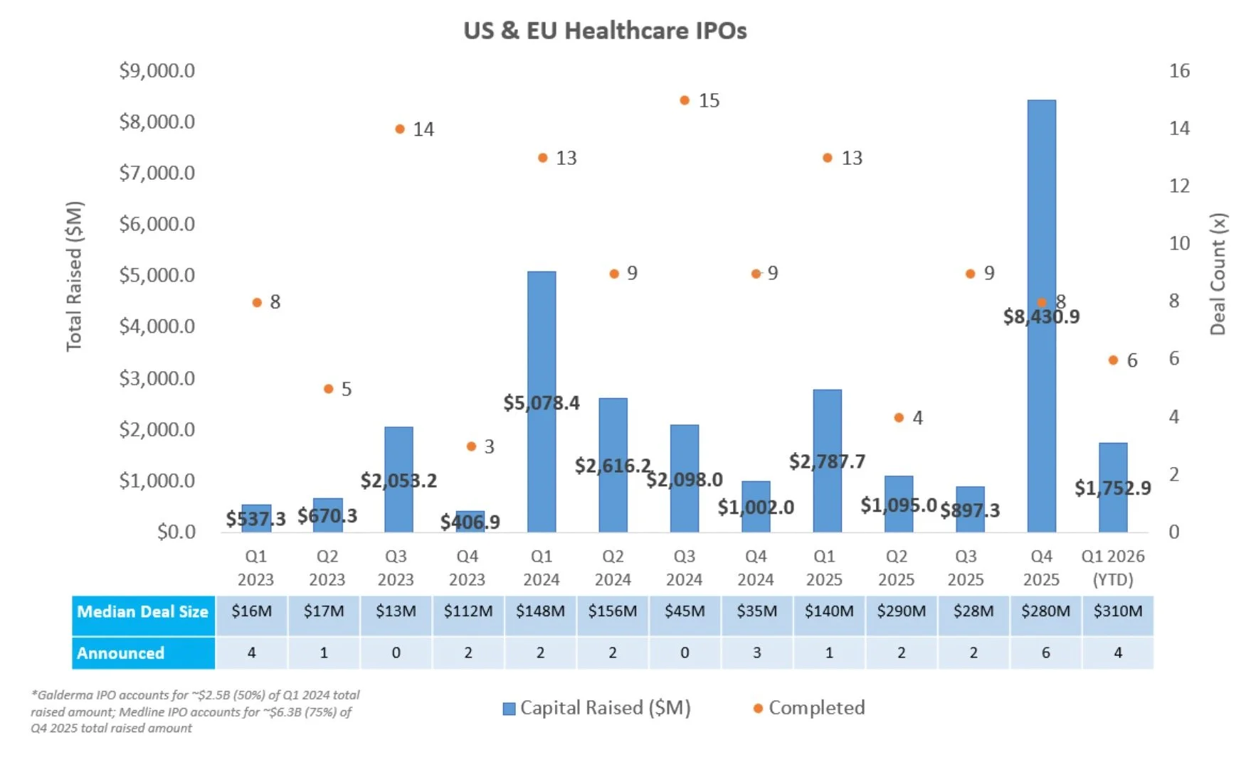 IPOs priced in 2025 and 2026 have generated a median and average return of (11.5%) and 14.0% YTD, respectively. Half of newly public companies are trading above their offer price